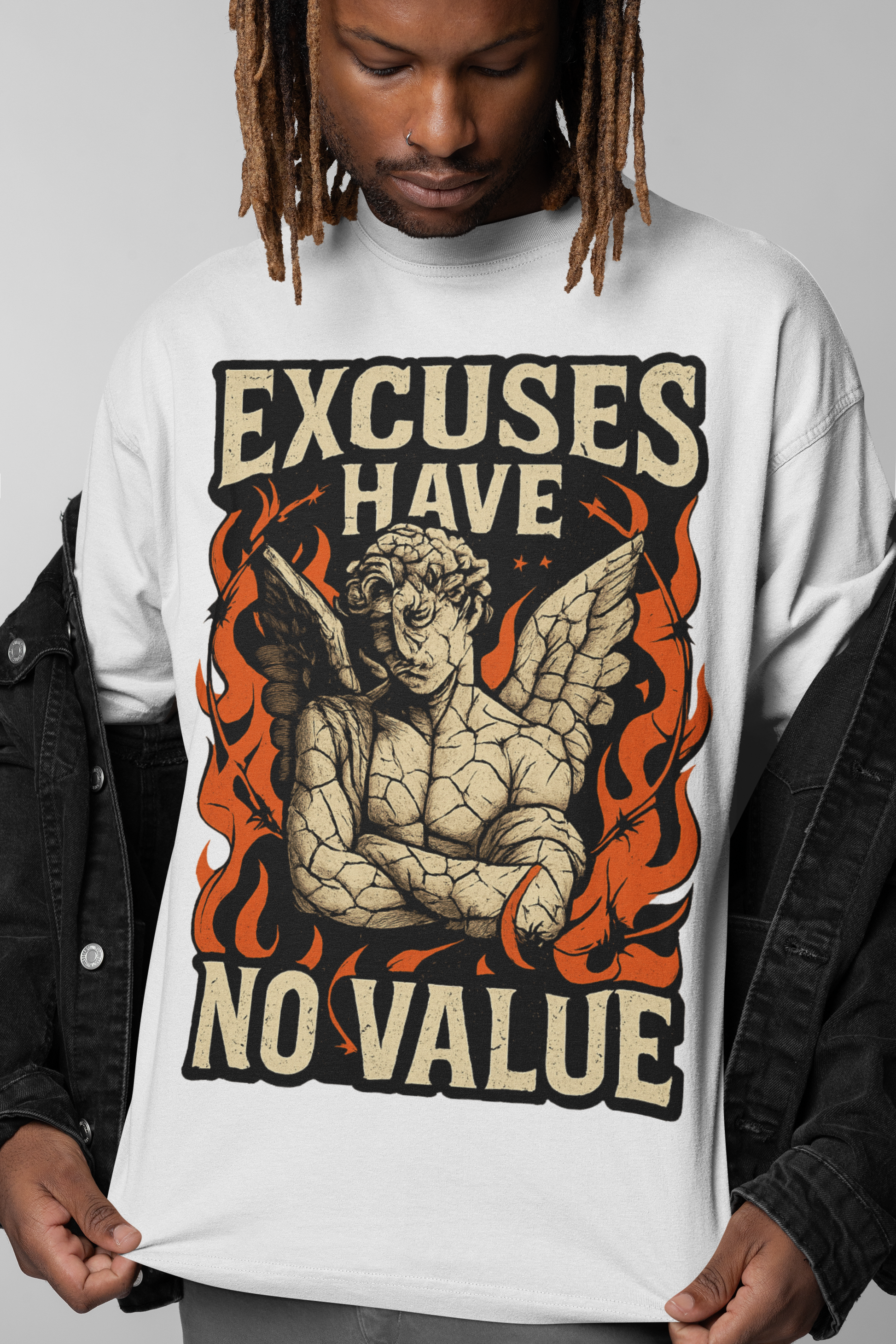 Make a statement without saying a word. This oversized streetwear tee features a cracked stone angel wrapped in flames — a symbol of strength, resilience, and accountability. The bold "EXCUSES HAVE NO VALUE" typography is a call to action for those who hustle hard and make no room for shortcuts. Crafted from heavyweight cotton, this tee delivers all-day comfort with an edge.